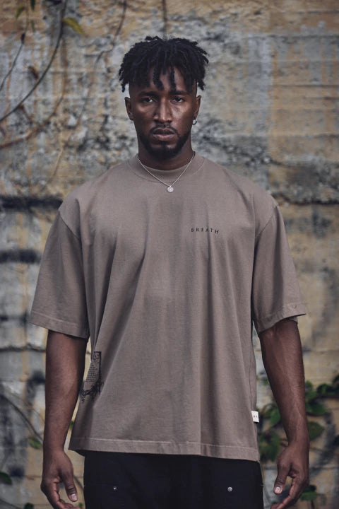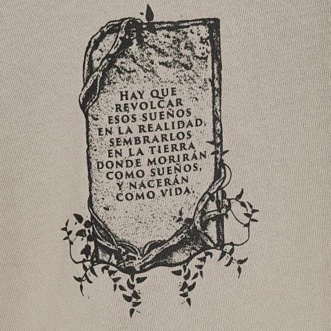 Corte Boxy,color café teñido espcialmente para Breath. Jersey 100% algodón 250 GSM. Estampado en serigrafía. Frase "Hay que revolcar esos sueños en la realidad, sembrarlos en la tierra, donde moriran como sueños, y naceran como vida".