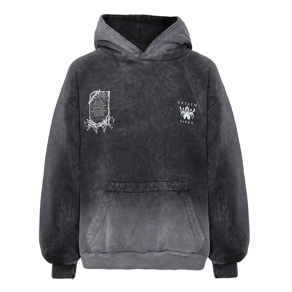 Corte Boxy, Este diseño tiene un lavado especial, que hace ver la tela con un efecto envejecido único. Burda 100% algodón 400 GSM, sin perchado. Estampado en serigrafía. Frase "Hay que revolcar esos sueños en la realidad, sembrarlos en la tierra, donde moriran como sueños, y naceran como vida".